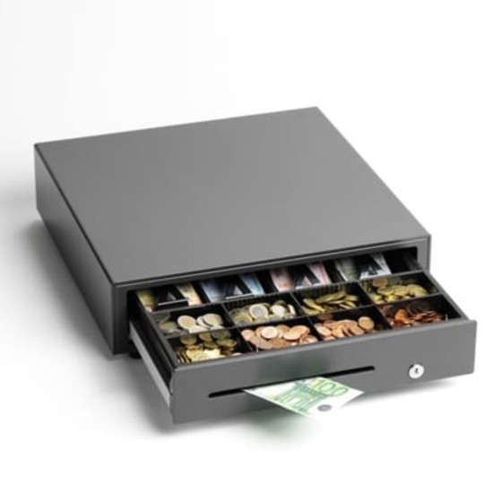 Metallinen kassalaatikko, 8 kolikkokoteloa ja 4 setelikoteloa, hiilenharmaa teräs. RJ11-liitäntä integroitua kassakoneelta avausta varten.